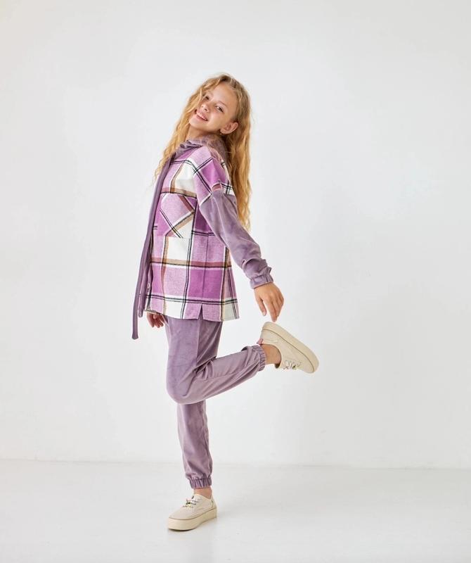 Современный и очень стильный костюм в сочетании шерсть клетка и королевского велюра Рубашка на пуговицах с капюшоном, штаны джоггеры с карманами замеры: длина рубашки/пог/рукав от горловины/брюки длина/шаг/пояс 116-44/42/51/71/48/24 122-49/43/53/76/52/24