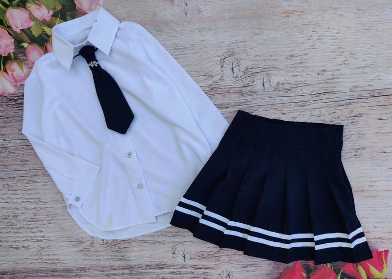 Крутой комплект блузка с галстуком+юбка тканина блузки софт юбочка ткань тиар хорошего качества блузка застегивается на пуговицы, юбка сбоку застегивается на молнию, на спинке есть резинка цвет - синий замеры: длина блузки/пог/рукав/юбка длина/пояс 122-54/37/43/33/26 128-56/39/44/36/28
