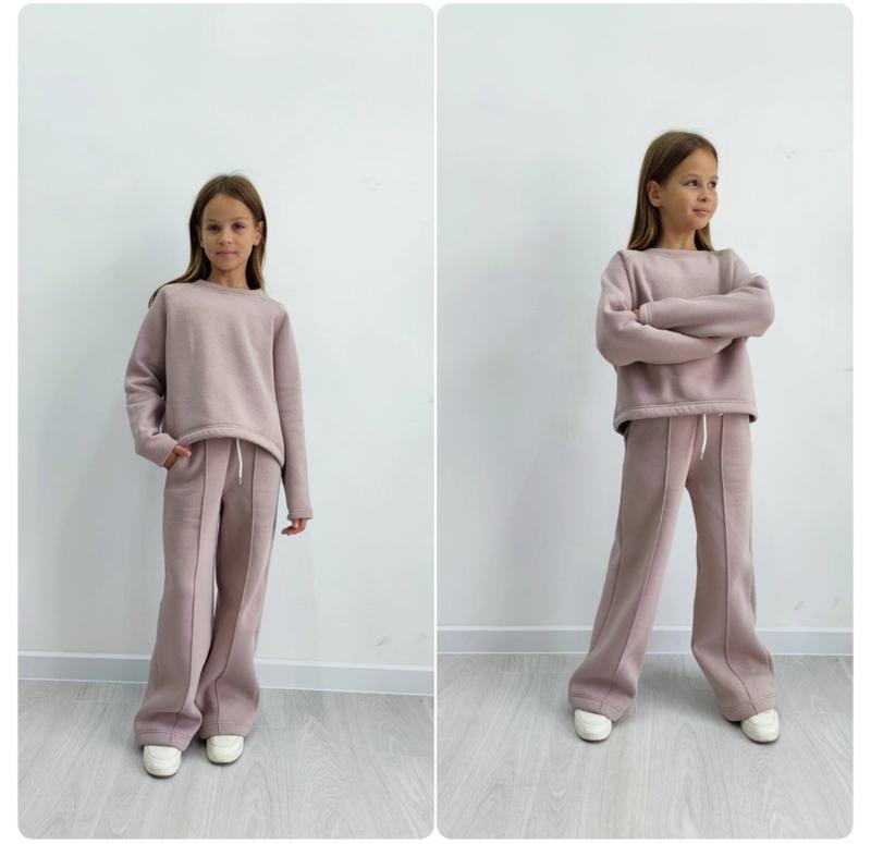 Стильный костюм для девочек Брюки палаццо + реглан Брюки с выстрочкой, есть карманы. Реглан снизу на шнуровке, можно регулировать. Ткань - турецкая трехнить на флисе, Замеры: 146 реглан длина - 51см, наплобхват груди- 52см, рукав от горловины - 64см. брюки длина - 90см, шаг - 66см, полуобхват бедер - 41см. Мс