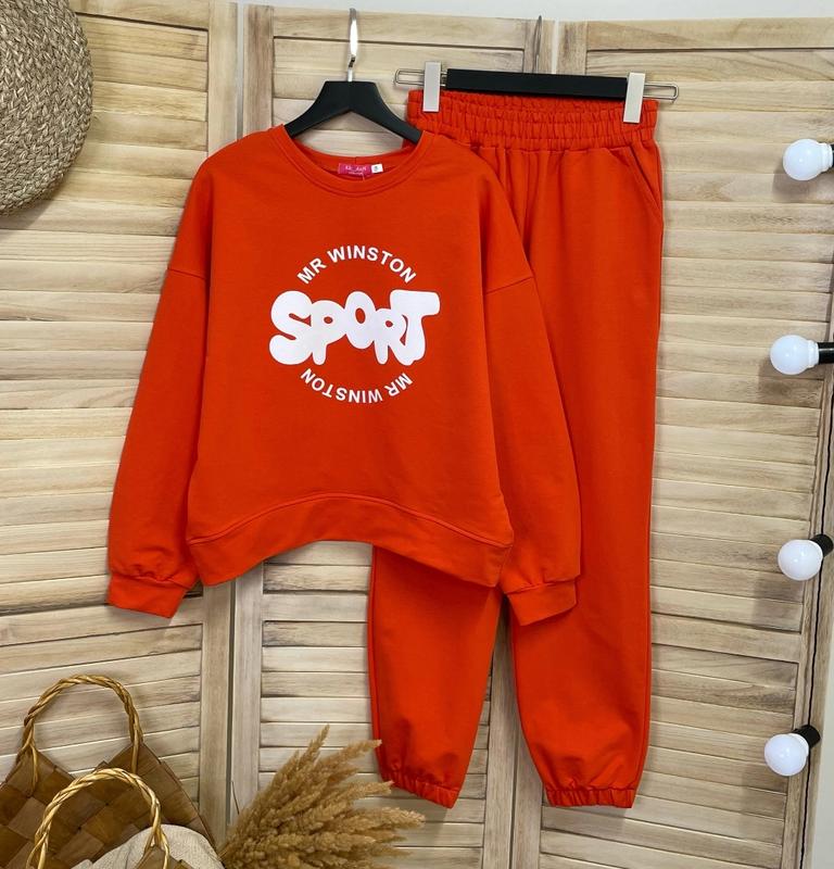 арт 3112 Стильный спортивный костюмчик Ткань турецкая двунитка подойдет для прогулок и занятий спортом Свитшот украшен двойным прорезиненным накатом рукавчик на манжете штаны под резинку есть карманы рост/длина/пог/рукав от горловины/длина брюк/шак/пот похибка+-2см 164/56/57/67/95/69/29-1шт