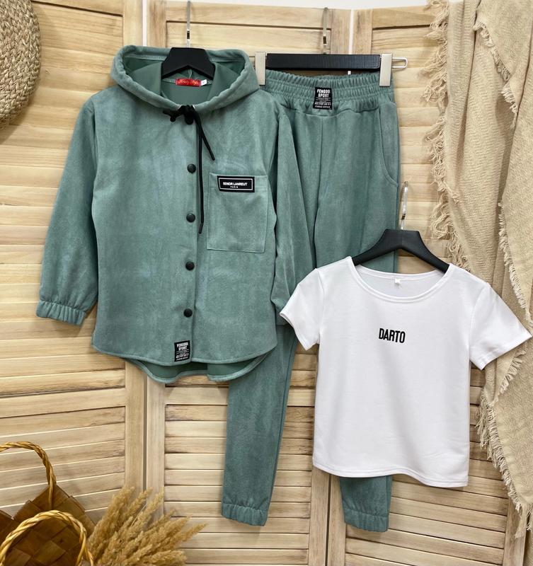Невероятно красивый комплект сорочка+футболка+штани с капюшоном на кнопках штаны с карманами под резинку ткань замш-диагональ (надписи на футболках могут быть другими) РЕКОМЕНДУЮ! цена 1230 грн рост/длин.рубашки спереди/пог/рукав от горловины/длин.футболки/пог/длин.штанов/крок/пот/поб похибка +-2см 140/56/45/55/43/35/90/65/26/44-2шт 146/58/47/57/44/37/93/67/26/46-1шт 152/61/48/59/46/39/97/69/27/47-2шт 158/63/49/61/48/40/100/71/28/49-2шт 164/64/50/63/49/42/104/74/30/50-2шт