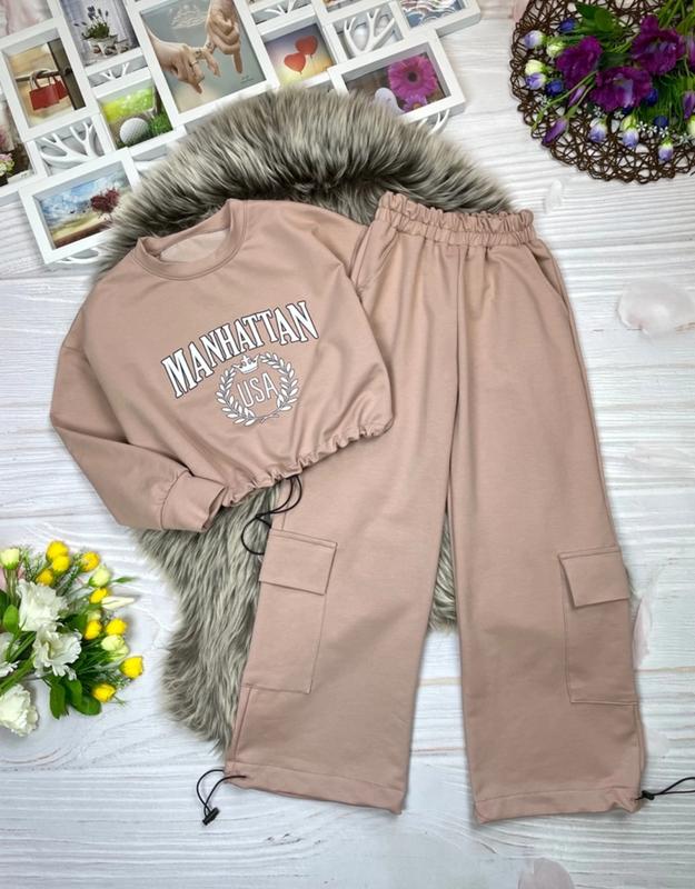 Стильный костюм для красавиц 💗 Укороченная кофта + штаны палаццо с затяжками, которые можно сделать карго Накладные карманы, пояс резинка красиво тянется Ткань турецкая двухнить качество пенье Замеры: длина/пог/ рукав от горловины/ длина брюк/шаг/пояс 140 - 37/47/57/. 85/60/25 152 - 45/49/63/. 97/67/26