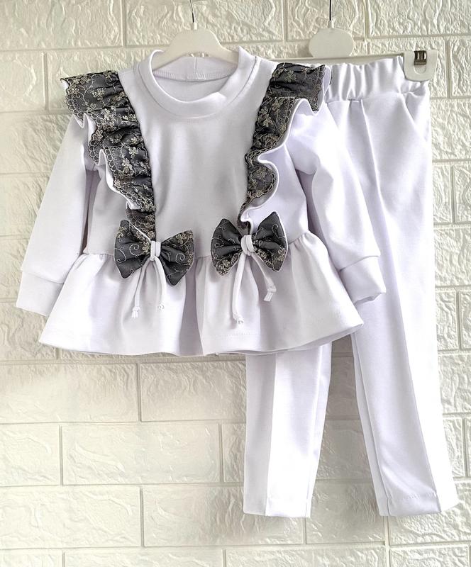 Очень красивый и нарядный брючный костюм для девочек. Кофта с баской, по переду и спинке рельефные швы украшены воланами с гипюром. По низу воланов симпатичные бантики. На брюках по переду отстроченные стрелки, пояс на резинке. Ткань трикотаж.(держит форму). Размеры для заказа согласно роста ребенка- 8**********, 110, 122, 128, 134.