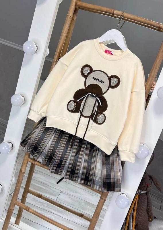 Арт 4414 НОВИНКА! Крутезный костюмчик свитшот и юбочка в складку тканина двунитка та сорочкова свитшот украшен невероятно хорошей аппликацией юбочка в талии под резинку РЕКОМЕНДУЄМО ! рост/длина/пог/рукав от горловины/длина/пот похибка +-2см 128/47/46/52/34/25-3шт 134/48/48/55/35/26-3шт 140/50/50/59/36/27-3шт 146/51/51/61/37/28-3шт 152/52/52/63/38/29-3шт Тан