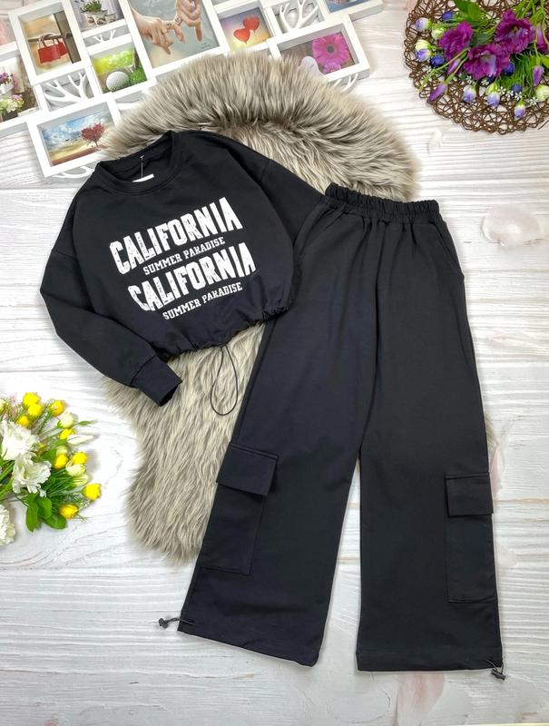 Стильный костюм для красавиц 💗 Укороченная кофта + штаны палаццо с затяжками, которые можно сделать карго Накладные карманы, пояс резинка красиво тянется Ткань турецкая двухнить качество пенье Замеры: длина/пог/ рукав от плеча/ длина брюк/шаг/пояс 140 - 37/47/57/. 85/60/25