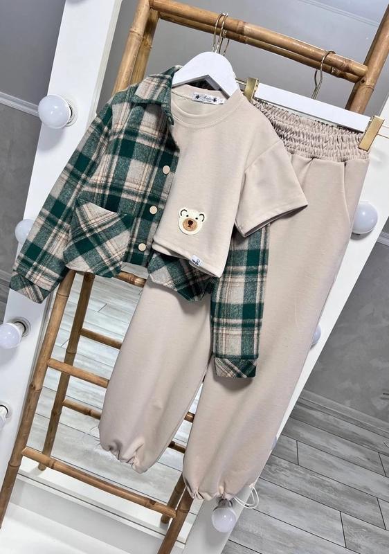Дуже крутий костюмчик 3в1 Сорочка+футболка+карго Тканина сорочки ніжна фланель Футболка і карго з преміум якості двунитки з ластиком Сорочка на кнопках футболка з гарними нашивками В штанах є кишені і по низу утяжка Не кашлатиться! Рекомендую Зріст/довж.сорочки/пог/рукав від горловини/довж.футболки/пог/довж.штанів/крок/пот/поб похибка+-2см 146-152/40/43/61/36/43/94/65/27/45-2шт 158-164/44/45/67/41/45/99/72/28/48-1шт