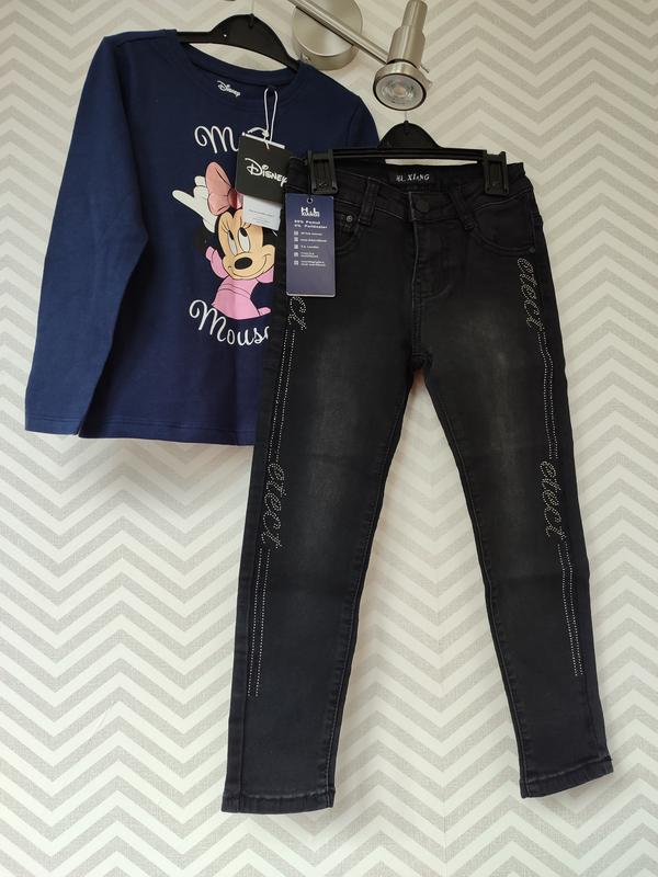Новый набор на девочку Черные джинсы с блестками сбоку Реглан Sinsay с Minnie mouse 👉 4-5 лет (110 см)