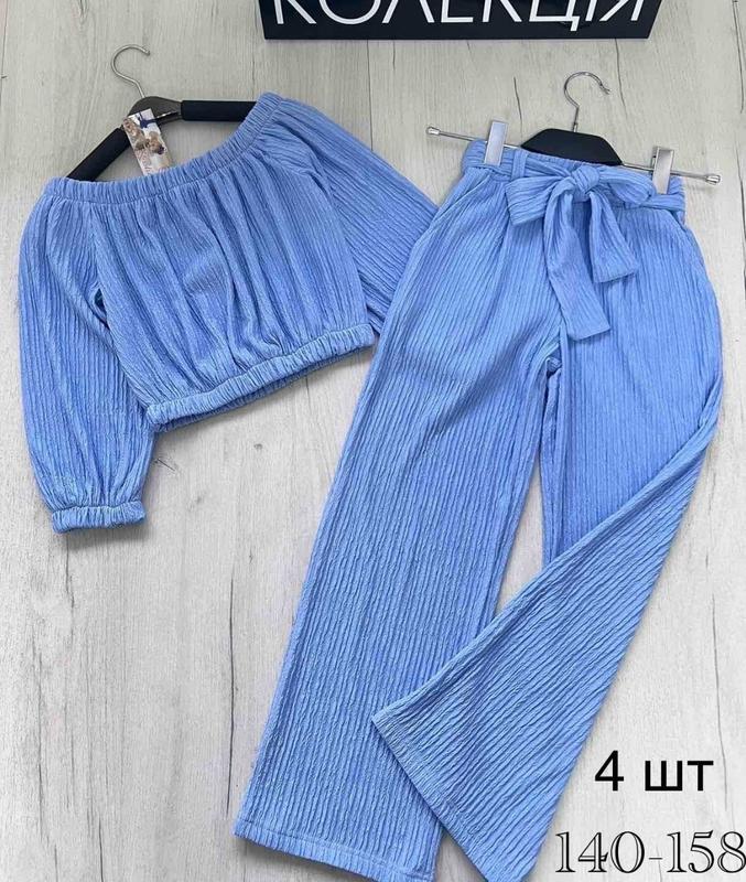 Костюм для дівчат. Штани палацо + топ. Пояс в штаних на резинці, є кишені, пояс в комплекті. Рукав 3/4, плече спущене. Тканина - трикотаж жатка. Заміри: 140 штани довжина - 84см, крок - 61см, пояс - 26см. топ довжина - 32см, напівобхват грудей - 34см. 146 штани довжина - 89см, крок - 64см, пояс - 27см. топ довжина - 34см, напівобхват грудей - 36см. 152 штани довжина - 92см, крок - 68см, пояс - 27см. топ довжина - 37см, напівобхват грудей - 39см. 158 штани довжина - 96см, крок - 71см, пояс - 28см. топ довжина - 39см, напівобхват грудей - 41см. Мс