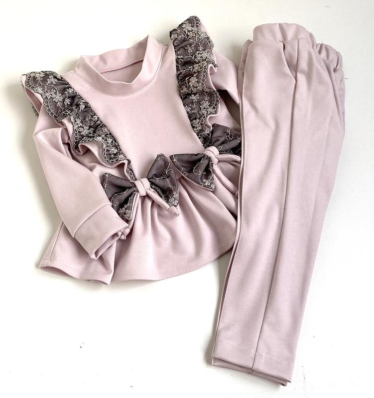 Очень красивый и очень нарядный костюм для девочки. Ткань приятная к телу- трикотаж. Брюки с отстроченными стрелками и функциональными карманами. Размеры для заказа согласно роста ребенка- 8**********, 110, 116, 122, 128, 134. Цена на костюм зависит от размера.