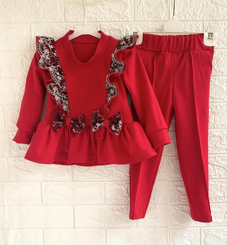 Гарний, ошатний, модний, стильний, яскравий костюм для маленьких модниць. Тканина трикотаж. Штани мають робочі кишені, спереду штанів відстрочені стрілки. Штани мають звужену форму донизу. Прилеглий силует. Розміри для замовлення відповідно до зросту дитини -- 86 Ціна залежить від розміру.