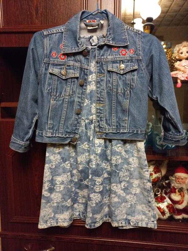 Костюм на девочку 3-5 лет смотря какой ребёнок. Замеры: платье- плечо 6 см, рукав 17 см, ширина плечей 27 см, подмышки 33,5 см, длина 65 см, пройма 16 см сзади замок; пиджак- плечо 8 см, рукав 39,5 см, ширина плечей 29,5 см, подмышки 38 см, длина от воротника 40 см. Состояние отличное, дефектов нет, замки и заклёпки всё на месте. Можно купить по отдельности. Товар пересылаю Новой и Укрпочтой.