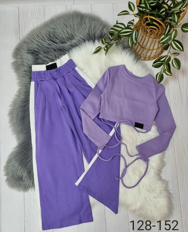 Симпатичный костюм для девочки Брюки палаццо двухнитка с высокой талией Очень стильно смотрится Топ мустанг рубчик, на зав’язках Качество отличное! 📍134-длина кофты 31, пог 32,рукав 49, длина брюк с учетом пояса 88, крок 60,пот 26 📍152-длина кофты 35, пог 36,рукав 55, длина брюк с учетом пояса 98, крок 68,пот 28 +-2см