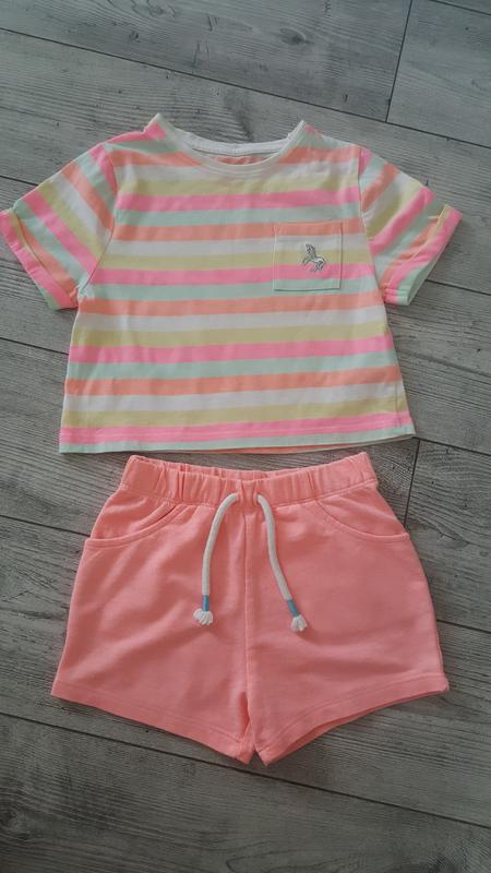 Просьба через кнопку КУПИТЬ оформлять после договоренности ❤ Костюм комплект набор для девочки футболка и шорты F&F. Футболка в полоску, свободный крой, широкий рукав, небольшой круглый вырез горловины. Модель чуть укорочена. Размер указан 4-5, лучше на 3-4. Короткие яркие шорты на резинке. Размер и состав срезаны. Подойдут на 3-4 года.