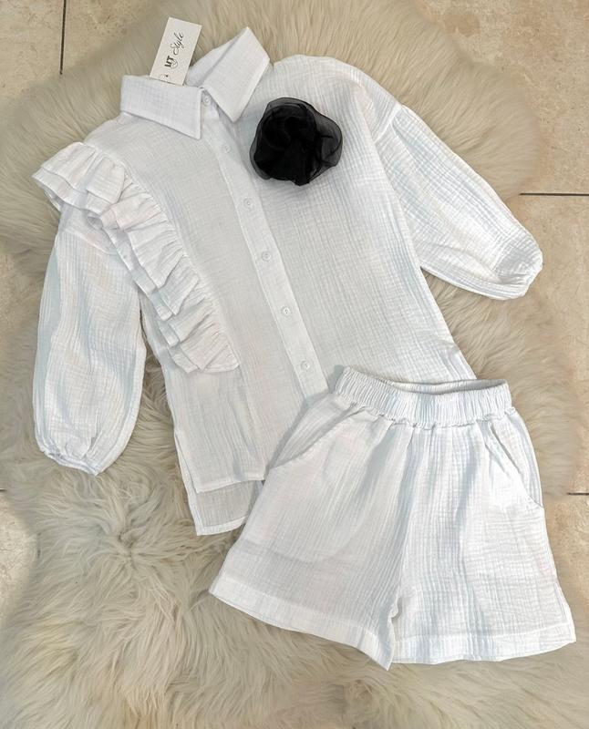 Костюм🌸 удлиненная рубашка, брошка снимается, шорты на резинке есть два кармана. Ткань муслин легкая и дышащая🥰 Рекомендую 🍒140-длина рубашки 55/59,пог 42,рукав от горловины 54, длина шорт 34,пояс 24, поб 42 🍒146-длина рубашки 57/61,пог 43,рукав от горловины 58, длина шорт 37,пояс 24, поб 45 🍒152-длина рубашки 58/63,пог 45,рукав от горловины 61, длина шорт 38,пояс 25, поб 47 🍒158-длина рубашки 60/64,пог 48,рукав от горловины 63, длина шорт 41,пояс 26, поб 50 🍒164-длина рубашки 63/68,пог 50,рукав от горловины 66,длина шорт 42,пояс 27, поб 53 +-2 см Греб