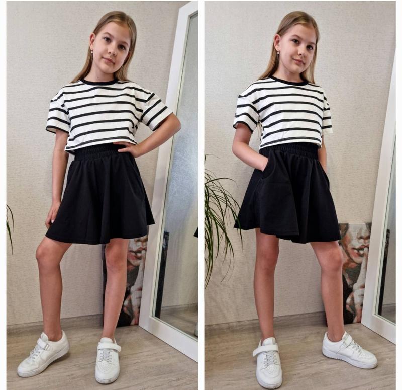 Костюм, топ + шорты-юбка. Пояс на резинке, есть карманы. Ткань - турецкая 2-х нить. Отличное качество! Замеры: 134 шорты длина - 36см, пояс - 25см. топ длина -30см, полуобхват груди - 38см. 140 шорты длина - 37см, пояс - 25см. топ длина -33см, полуобхват груди - 39см. Мс