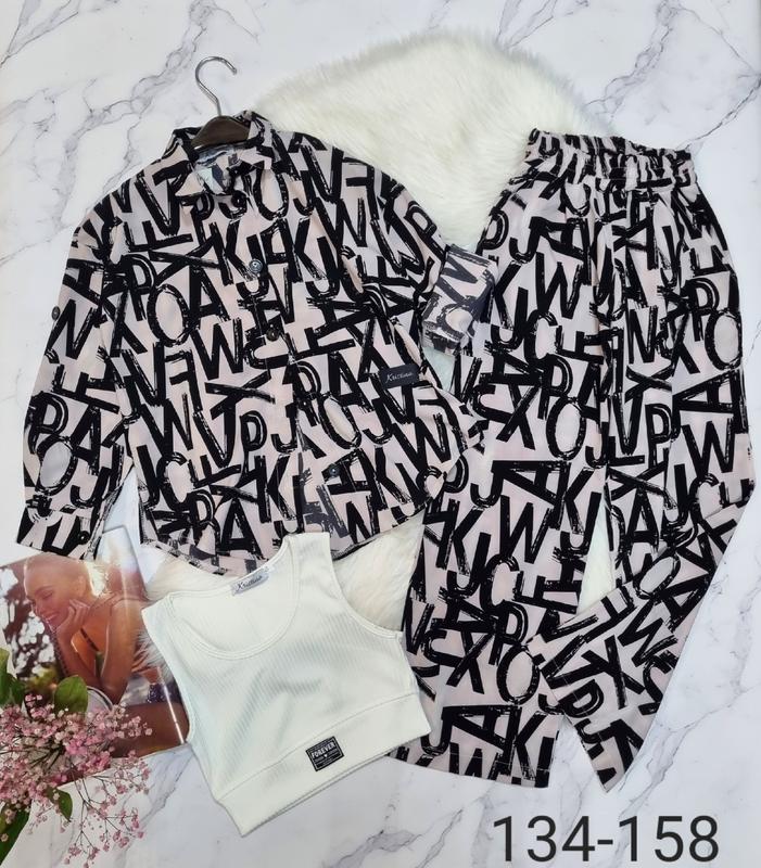 Супер удобный и стильный костюм «тройка» В комплект входит рубашка и штаны свободного кроя+топ. Комфорт,стиль и 😍🔥Тканина : супер софт ( принт) топ- мустанг. Модель🔥🔥🔥 🍒134-длина рубашки 52,пог 43,рукав от горловины 53,длина брюк 80, крок 58,пояс 25,поб 43,длина топа 29, пог 29 🍒140-длина рубашки 55,пог 45,рукав от горловины 56,длина брюк 83, крок 62,пояс 26, поб 44, длина топа 30, пог 30 🍒146-длина рубашки 57, пог 47,рукав от горловины 58, длина брюк 86, крок 64,пояс 27, поб 45, длина топа 32, пог 32 Греб