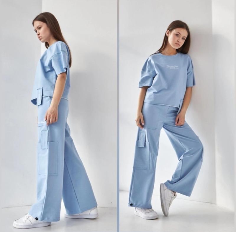 Стильный костюм 🔥 Футболка свободного кроя и брюки -карго снизу на затяжках (с прямых превращаются в джоггеры). Ткань -турецкая двунить. Замеры: 146 брюки длина - 91см, шаг - 64см, пояс - 26см, полуобхват бедер -40см. футболка длина - 41см, полуобхват бедер - 46см. Мс