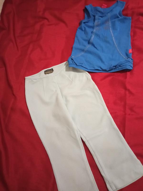 Комплект одежды для девочки примерно р. 122-134 Бриджи нежноголубого цвета, сбоку застегиваются на молнию ПОТ 28 см, ПОБ 39 см, длина 64 см, шаг 41 см. Футболка ярко синего цвета длина 46, ПОГ 34 см. Наложенным платежом не отправляю
