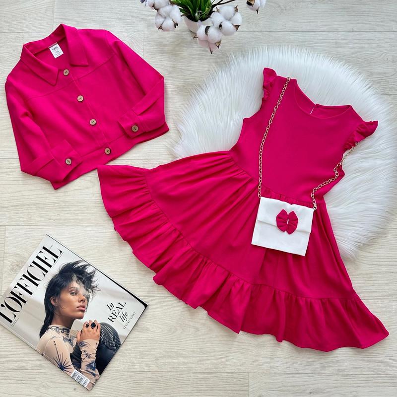 Стильное платье с пиджачком и сумочкой 🥰🥰🥰 Легкая, дышащая, нежная 💕💕💕 Пышная юбка😍 Сзади платья застежка пуговица 😌 Пиджачок на пуговицах 💗В дополнение образу в комплекте сумочка 👛 Тканина: льон 🌸 Производитель: Украина 🇺🇦 р.98-2шт р.104-3шт р.110-1шт р.116-нет р.122-нет ЗАМІРИ +/-1-2см!!! ▪р.98- Платье: длина 53см/ ПОГ 27см/ ширина талии 26см. Пиджачок: длина 29см/ рукав от плечевого шва 35см/ ПОГ 31см. ▪р.104- Платье: длина 57см/ ПОГ 28см/ ширина талии 27см. Пиджачок: длина 31см/ рукав от плечевого шва 37см/ ПОГ 32см. ▪р.110- Платье: длина 60см/ ПОГ 29см/ ширина талии 29см. Пиджачок: длина 33см/ рукав от плечевого шва 39см/ ПОГ 33см.