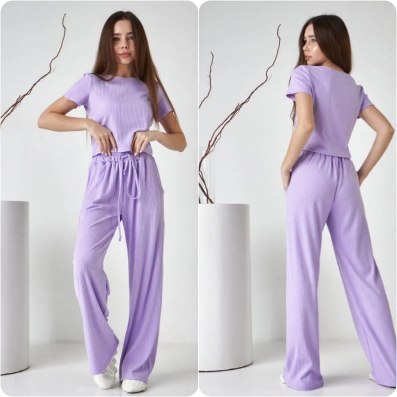 модняшка Комплект двойка для девочек. Штани палаццо+футболка-топ. В брюках есть карманы, в поясе есть поясок-утяжка. Ткань - трикотаж милый рубчик. Цвет - лаванда. Замеры: 140 брюки длина - 89см, шаг - 64см, пояс - 27см, полуобхват бедер - 47см. футболка жедлина - 32см, полуобхват груди - 35см. 146 брюки длина - 94см, шаг - 68см, пояс - 27см, полуобхват бедер - 50см. футболка жедлина - 34см, полуобхват груди - 37см.