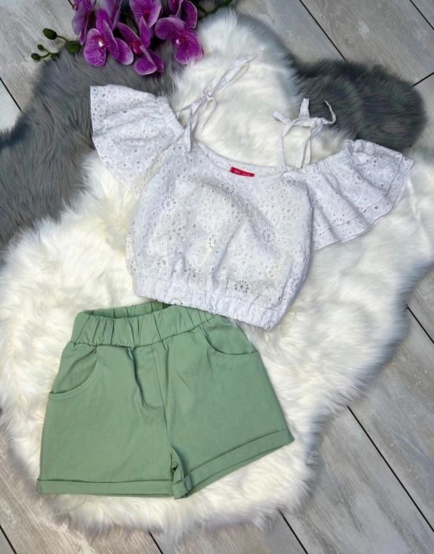 Бомбезный костюм Блуза из прошвы и шорты стрейч коттон Размеры Длина/пог/длина/пояс 146-29/36/30/27 152-30/38/31/28 158-32/39/32/28 Аб