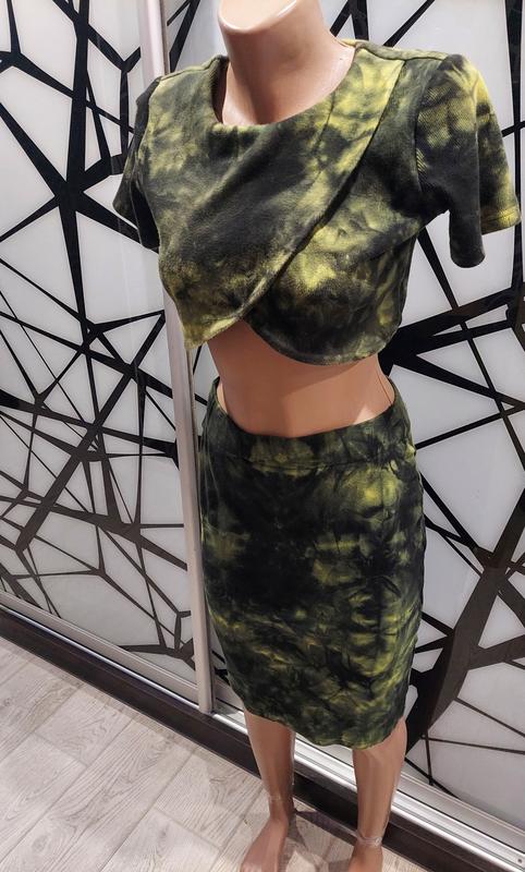 Костюм в рубчик топ и юбка абстракция хаки. Состояние идеальное. Подойдет на худенькую невысокую женщину, девушку 42-44 размера или подростка. Производство Украина.