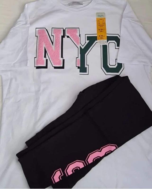 Футболка + лосины Размер 140 (9-10 лет) Замеры футболки: длина 60 ширина полуоб 43 Замеры лосин: длина 72 шаговый 55 ПОТ 30 (тянется до 37)