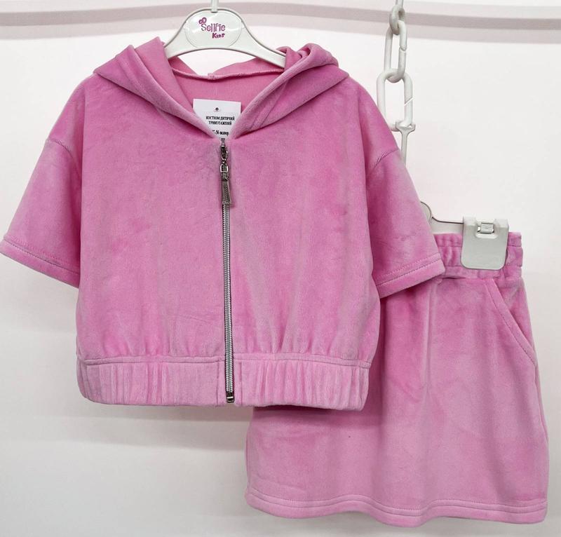 Костюм - двойка детский, велюровый, с юбкой, для девочки, худи с капюшоном, юбка, розовый