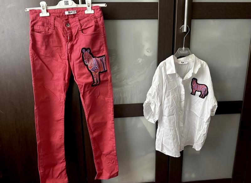 Очень красивый комплект Msgm известного бренда для модных детей размер по бирке 10 , штаны с утяжкой рубашка легкая не жаркая , наш любимый комплект жаль выросли с него