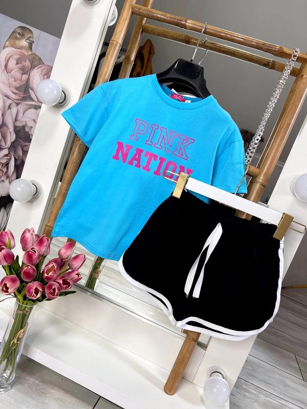 Крутэцкий костюм, шорты и футболка с трендовой надписью. Ткань двунитка и турецкий кулир, пояс на резиночке, очень красиво сидит. Длина/пог/длина/пояс 134-48/39/28/26 140-50/41/30/27 146-51/42/31/28 152-53/45/32/29 158-55/47/33/30 164-57/49/34/31