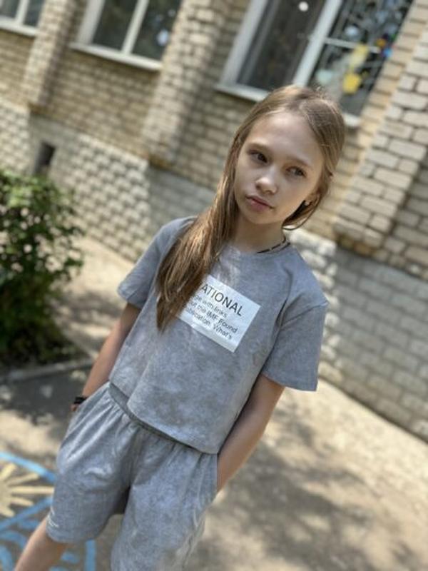 Легкий и практичный костюм топ и шорты! Футболка-топ с принтом. Шорты с карманами. Ткань стрейч трикотаж Турция. Размеры 128- длина футболки 36, шорты 35 134 – футб 37, шорты 36 140 – футб 40, шорты 37 146 – футб 42, шорты 38 152 – футб 43, шорты 39 158 – футб 45, шорти 41