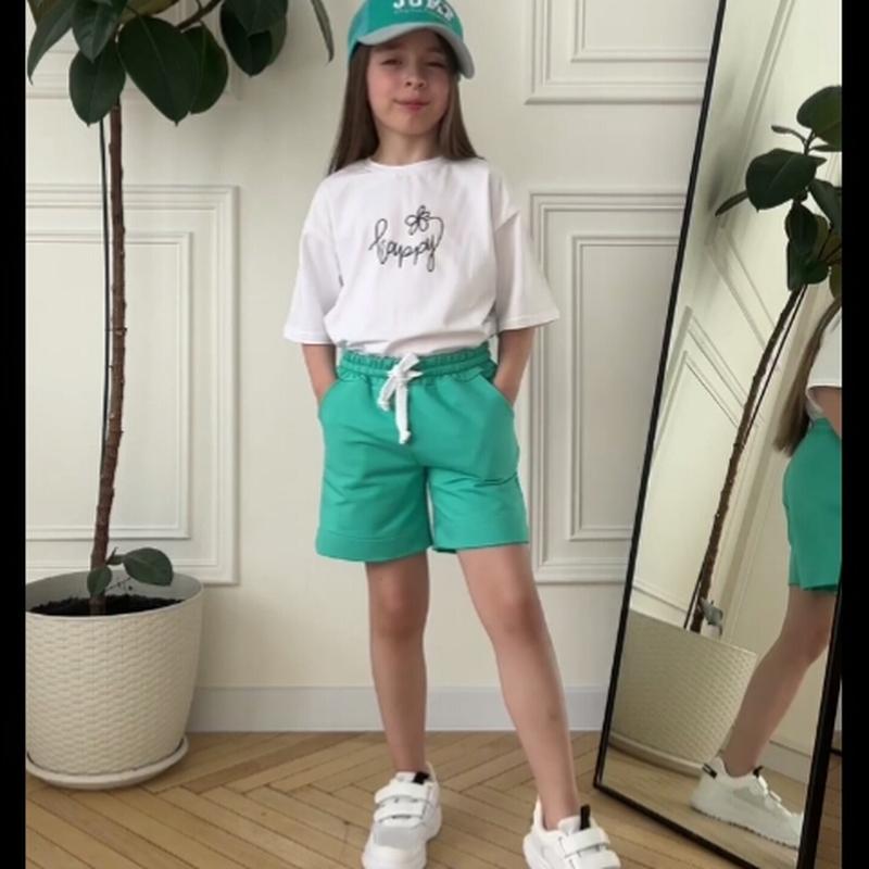 цена зависит от размера: 98р-300грн 104-350 110-38**********-420 128-440 134-450 140-470 146-490 Стильный летний комплект для девочек состоит из футболки кроя "Oversize" из однотонного стрейч-кулира, а также свободных объемных шортов из двухниточного футера. Футболка с короткими рукавами, округлым вырезом, спущенной линией плеча, спереди нанесен стильный накат, выполненный методом шелкотрафаретной печати. Шорты с высокой посадкой, карманами в боковых швах, широкой резинкой в поясе и шнурком. Комплект станет незаменимым модным обновлением летнего гардероба юной модницы, рекомендуется дополнить образ объемными кроссовками, босоножками в спортивном стиле или кедами. Полотно: стрейч-кулир, двухниточный футер Склад: 95% бавовна, 5% еластан; 80% бавовна, 17% поліестер, 3% еластан Рекомендации по уходу: стирать при температуре не более 30°C, рисунок гладить только по изнаночной стороне.