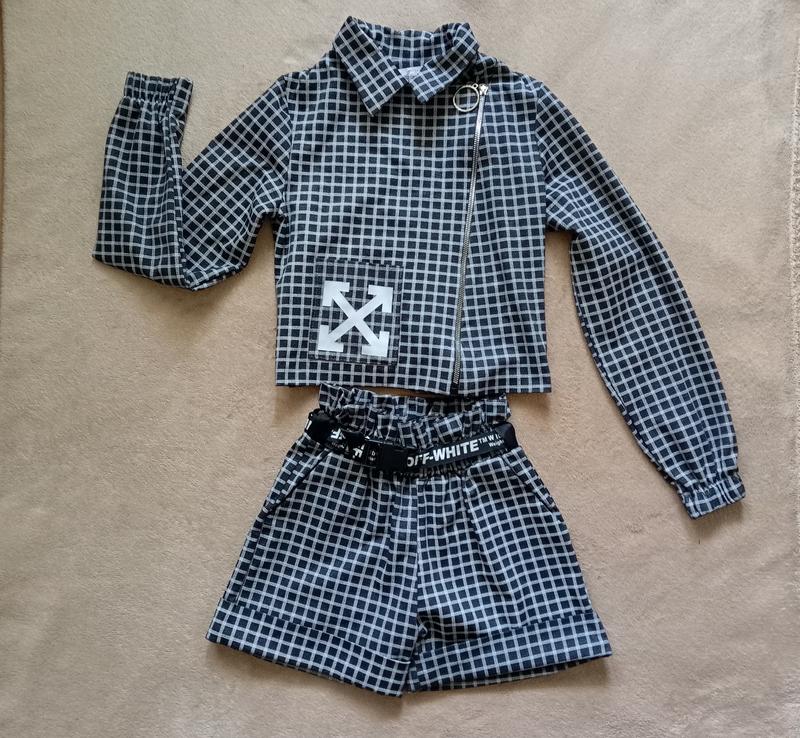 Интересный костюмчик на девочку. Шортики на резинке и есть съемный пояс, два кармана спереди, сзади карманы-обманки, курточка в стиле косуха, имеет один накладной карман, майка-топ на резинке. Общее состояние идеально, кроме двух пятен на спинке (заводской брак), показала на последнем фото. Указан размер 158, но советую ориентироваться на замеры: Куртка ПГ - 40 Длина - 40 Ширина низа - 34 (тянется до 40) Плече - 9 Длина рукава - 57 Шорти ПТ - 25 (тянется до 39) ПБ - 42 Длина - 34 Высота посадки - 29/32 Майка Длина - 34 Ширина низа - 21 (тянется до 38) С безопасной оплатой через Укр-почту не работаю!