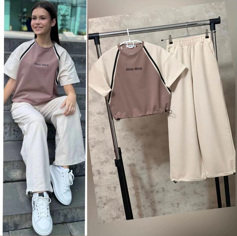 Стильний костюм Футболка вільного крою та штани. В штанах є кишені, знизу на затяжках ( з прямих перетворюються в джогери ). Тканина -турецька двонитка пеньє. Якість суперова! Заміри: 146 штани довжина - 91см, крок - 64см, пояс - 25см, напівобхват бедер - 42см. футболка довжина - 43см, напівобхват грудей - 44см. Мс