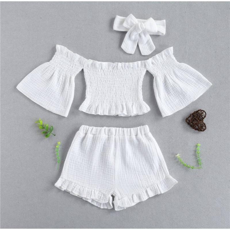 Заміри: ===РОЗМІР 80=== ТОП довжина (по центру спинки) 16 см ширина 20 см ШОРТИ довжина 20 см стегна 29 см ===РОЗМІР 100=== ТОП довжина (по центру спинки) 18 см ширина 22 см ШОРТИ довжина 22 см стегна 31 см Комплект топ, шорти і пов'язка муслін