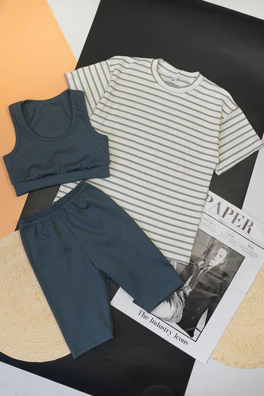 Цена зависит от размера 116р - 375грн 122р - 400грн 128р - 425грн 134р - 450грн 140р - 475грн 146р - 500грн 152р - 535грн 158р - 560грн 164р - 585грн Легкий и практичный комплект в спортивном стиле выполнен для девушек подросткового возраста. Состоит он из удлиненной футболки «oversize», топа и трес. Комплект скомбинированный из полосатого и однотонного полотна в рубчик разной плотности. Благодаря эластичности и мягкости материала, модель не сковывает движений и создает комфорт и удобство. Изготовлен комплект из трикотажа мустанг (86% полиэстер, 14% эластан), который является стрейчевым полотном. Материал приятно прилегает к телу, не вызывает раздражений и аллергии. Подходит для пошива топов, платье, стильных трикотажных костюмов и др