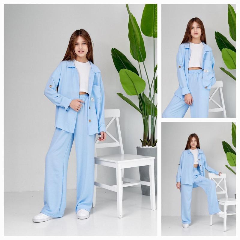 Стильный костюмчик тройка 🔝🔝🔝 Сорочка, палаццо, футболка-топ 🤩🤩🤩Воздушный, нежный, легкостенький 🥰 Рубашка свободного кроя с удлиненной спинкой😍 на пуговицах 👌🏻 Перчатки-трансформеры 🤩 Брюки-палаццо на широкой резинке👍🏻 есть кошечки 🥰 Футболка-топ рубчик 💞 Тканина: жатка 🔝 Производитель: Украина 🇺🇦 ЗАМІРИ ⤵ +/- 1-2см!!! ◾р.134- СОРОЧКА: длина впереди 56см/ длина по спинке 58см/ рукав от горловины 58см/ ПОГ 43см. Штаны: длина 87см/ шаг 61см/ ширина бедер 42см. ФУТБОЛКА-ТОП: длина 31см/ ПОГ 30см ◾р.140- СОРОЧКА: длина впереди 59см/ длина по спинке 61см/ рукав от горловины 62см/ ПОГ 45см. Штаны: длина 90см/ шаг 65см/ ширина бедер 44см. ФУТБОЛКА-ТОП: длина 33см/ ПОГ 32см ◾р.146- СОРОЧКА: длина впереди 59см/ длина по спинке 65см/ рукав от горловины 66см/ ПОГ 48см. Штанины: длина 94см/ шаг 68см/ ширина бедер 46см. ФУТБОЛКА-ТОП: длина 34см/ ПОГ 33см ◾р.152- СОРОЧКА: длина впереди 61см/ длина по спинке 68см/ рукав от горловины 70см/ ПОГ 52см. Штаны: длина 97см/ шаг 70см/ ширина бедер 48см. ФУТБОЛКА-ТОП: длина 35см/ ПОГ 34см ◾р.158- СОРОЧКА: длина впереди 67см/ длина по спинке 72см/ рукав от горловины 72см/ ПОГ 53см. Штанины: длина 101см/ шаг 75см/ ширина бедер 50см. ФУТБОЛКА-ТОП: длина 36см/ ПОГ 46см