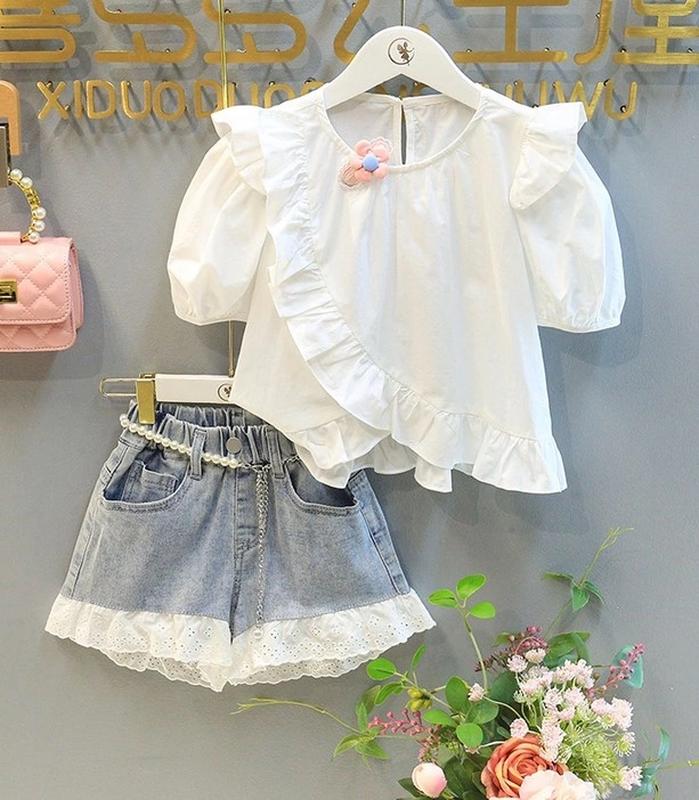 10536) ЦИНА 525ч РАЗМЕР 100 (2 шт) 110 (3 шт) 130 (2 шт) 140 (2 шт) Комплект блузка и шорты блузка материал хлопок шорти джинс Легкий и приятный к телу костюм для девочки на лето Замеры: р.100 - блузка: длина 39 см, ширина 33 см; шорты: длина 30 см р.110 - блузка: длина 42 см, ширина 37 см; шорты: длина 33 см, р.130 - блузка: длина 47 см, ширина 37 см; шорты: длина 34 см р.140 - блузка: длина 49 см, ширина 43 см; шорты: длина 34 см