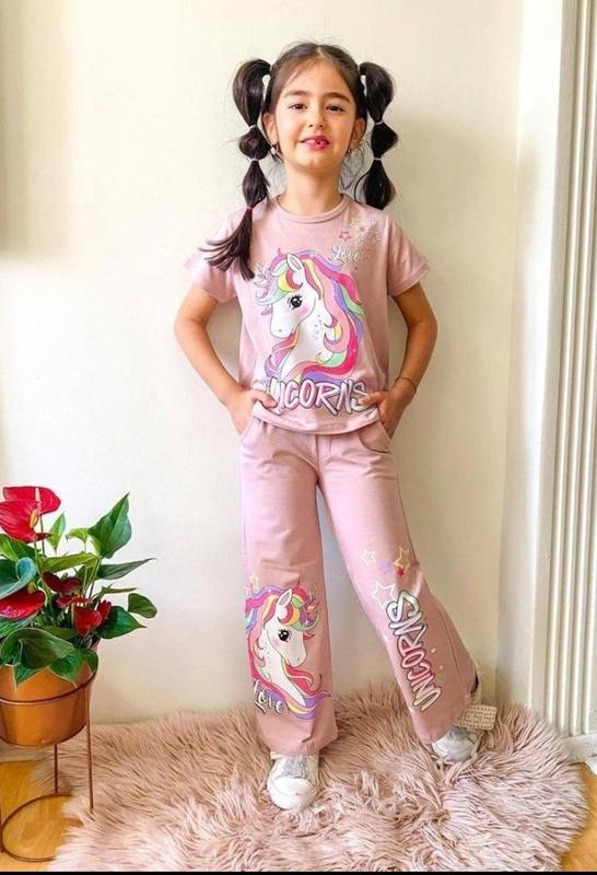 Яркий костюм для девочки. Футболка и кюлоты. Материал 90% коттон, 10% эластан. Украшен качественным накатом, который не будет трескаться после стирки. Ткань не теряет цвет и форму. Производитель Турция! арт 4410 3-4р. Длина футболки 38см., ширина 33см., длина кюлотов 61см., шаг 40см.. – 1шт.
