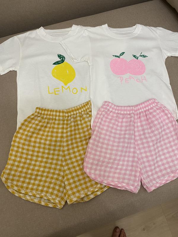 Гарний та зручний літній комплект. Натуральна тканина. Розмір жовтого вказаний 120, рожевого 110. Заміри є на фото