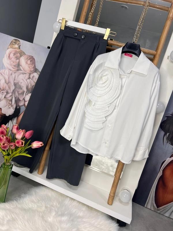 Чрезвычайно эффектный костюм Костюмка ткань и жатка, палаццо на молнии и пуговице, в поясе сзади резинка, блузка на пуговицах, украшения пришиты. Качество супер! РЕКОМЕНДУЮ! Замеры от горловины: Длина/рукав/пог/длина брюк/крок/п*******-92/66/29 146-59/61/45-95/69/30 152-61/64/47-97/71/31