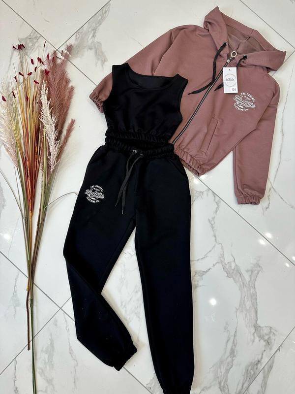 Таня арт 5405 Костюм тройка из турецкой качественной двунитки Качественная двухкомпонентная печать Кофта на молнии, есть карманы Брюки на резинке есть рабочий шнурок и карманы КАЧЕСТВО ЧУДОВА!! РЕКОМЕНДУЮ!!! Рост/длина кофты/пог/рукав от горловины/длин.топа/пог/длина брюк/крок/пот/пот Похибка +-2см 134/44/45/54/25/29/77/55/23/39-2шт 152/51/51/60/29/35/87/65/27/43-2шт