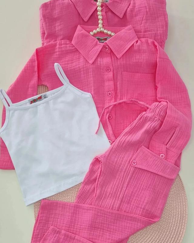 Муслиновый костюмчик тройка Муслиновая рубашка на пуговицах можно укоротить рукав, брюки муслиновые на резинке есть утяжка с карманами, топ Производитель Турция 👍 немного маломерят 2-3 Рубашка длина 37, рукав от воротничка 46, пог 33. Штани 57, пояс 22. Топ 32