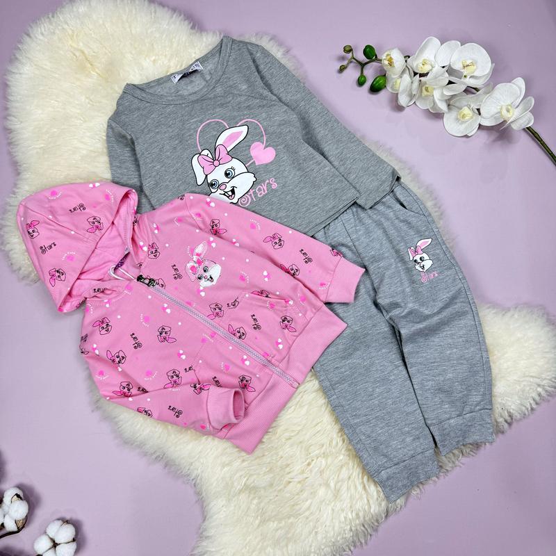 🌸Костюм тройка Зайка Stars нежно розовый. Кофточка с капюшоном, застежка на замочке, кармашки спереди. Брюки с карманами, в поясе резинка. Легкий реглан с рисунком. Рисунок - накат. Производитель Венгрия. 📐Замеры: Маломерит!!! Ориентировочно на 2 размера!!! 86 - кофт. довж. 31/ полуобхив 27/ руки 27/ брюки длин 38/крок 22 92 - кофт. довж. 32/ полуобхив 28/ руки 29/ брюки длин 41/крок 26 98 - кофт. довж. 34/ полуобхив 29/ руки 30/брюки длин 45/крок 28 104 - кофт. довж. 36/ полуобхив 30/ру 32/ брюки длин 49/крок 32 110 - кофт. довж. 36/ полуобхив 32/ру 33/ брюки длиннее 51/шар 34 116 - кофт. довж. 38/ полуобхив 32/ руки 34/ брюки длиннее 53/шар 36 ‼️ Маломерит!! Ориентировочно на 2 размера!!!