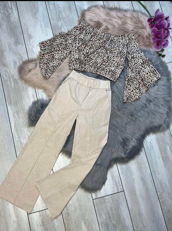 Невероятно стильная новинка лана штаны палаццо и топ с клешеным рукавчиком Тканина льон і супер софт Длина/пог/длина/шак/пояс 146-32/40/90/63/25см 152-33/43/93/66/26см, есть шкаф доставка