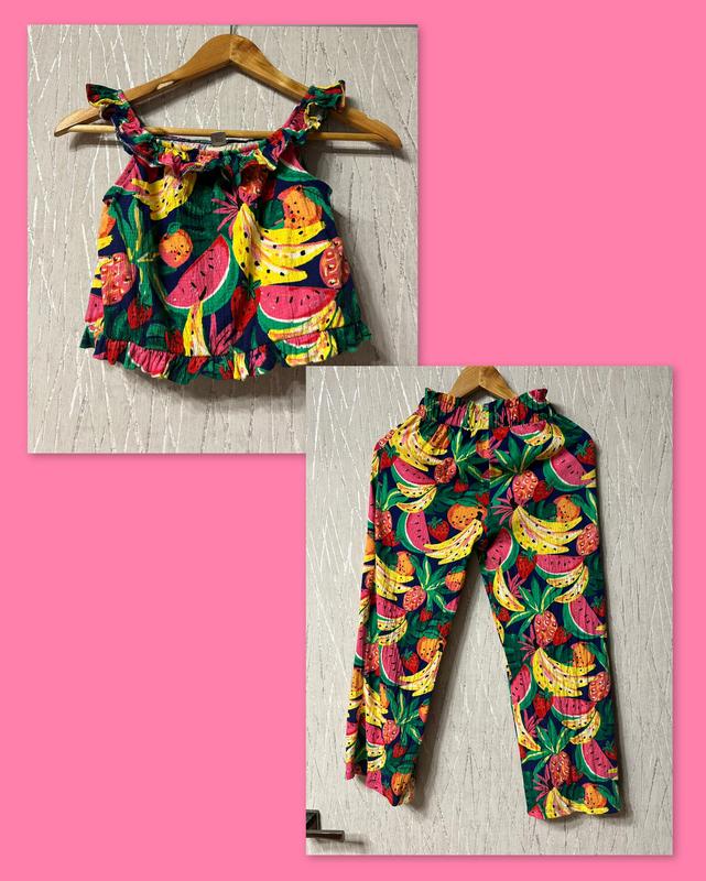 Комплект для девушек-подростков на рост 140 см, в который входит топ и свободные кюлоты. Топ свободного кроя, с рюшами и округлым вырезом. Кюлоты с высокой посадкой и поясом с широкой эластичной резинкой.