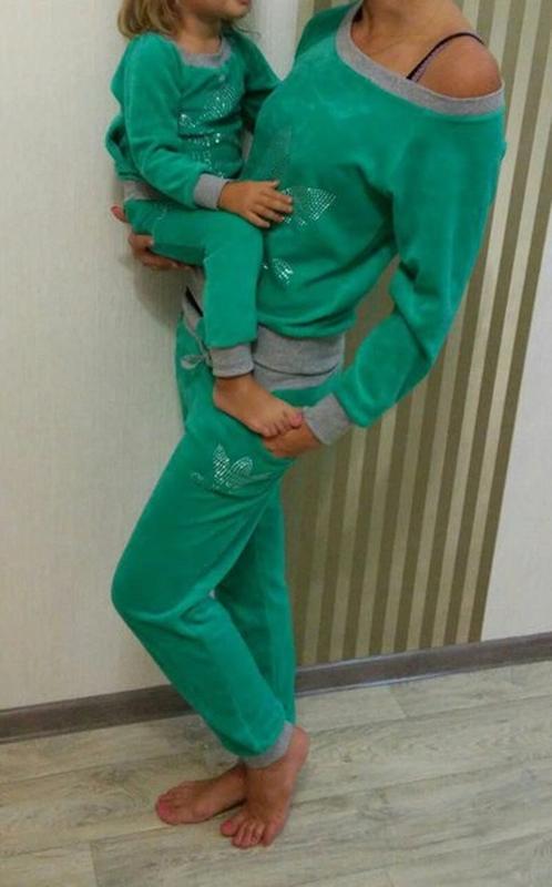 Костюмы в стиле family look, плотный велюр. Состояние хорошее, без дефектов. С бокалов рассасывались шнурки из брюк, просто их вытащили, но они на резиночке поэтому не критически, можно вставить любой шнурок или красивую атласную ленту. Детский на рост 92-98 Для мамы размер М Рукав от плеча-61см длина по спине -55см Полуобхват в груди 47см длина брюк 91см шаговый-75 см обхват бедер-100 см