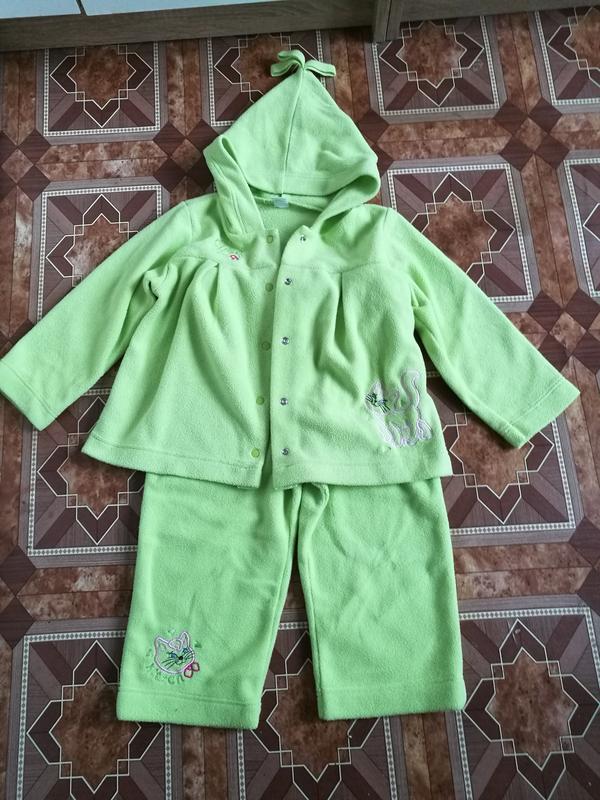 Флісовий костюмчик моєї донечки. Куртку носили частіше, штани в стані нової речі. Крій штанів прямий з глибокою посадкою, можливо і під памперс. Фліс середньої товщини, не тонкий. На штанцях взагалі без катишок, на кофті зсередини є, бо її любили і носили) Штани на резинці, без регулювання, бантик то для краси. Купували новим, виробництво Україна. Якісний, теплий і гарний костюмчик. Пересилаю.