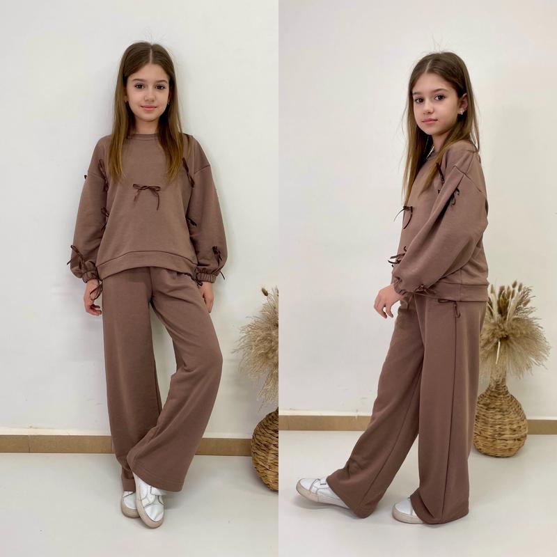 Таня Арт 5949 Крутой костюм с игривыми бантиками Штаны палаццо в поясе под резинку Ткань качественная турецкая двухнить-петля Хорошее качество! Рост/длин.свитшота/пог/рукав от горловины/длин.штанов/шаг/пот/пос похибка+-2см 128-134/45/45/49/80/58/24/40-1шт 134-140/46/46/52/84/61/25/41-3шт 140-146/48/47/55/88/64/26/43-3шт