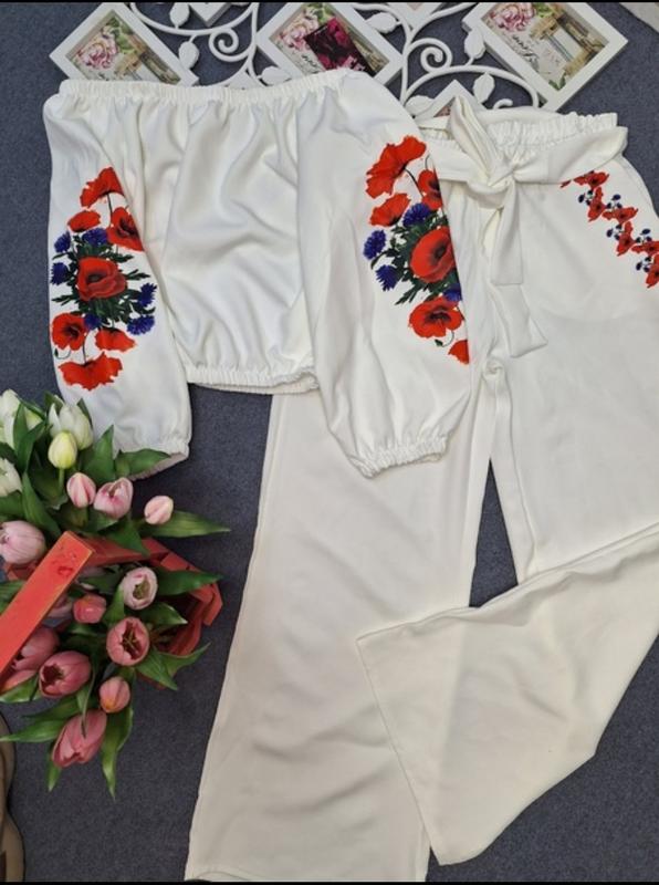 Крутой костюм с термо вышивкой, блуза-топ и брюки палаццо